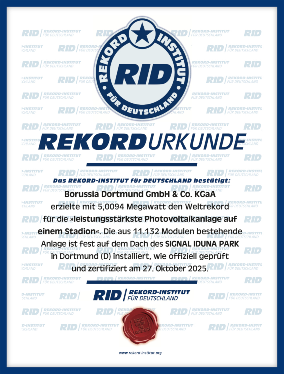 Im gemeinsamen Projekt wurde die Photovoltaikanlage auf dem Dach des Dortmunder Stadions SIGNAL IDUNA PARK erneuert und vergrößert: Mit 11.132 Solarmodulen und einer Leistung von über 5 Megawatt (MWp) wurde die weltweit leistungsstärkste Photovoltaikanlage auf einem Stadiondach fertiggestellt. Der Weltrekord dieser Anlage wurde durch das Rekordinstitut Deutschland offiziell bestätigt.